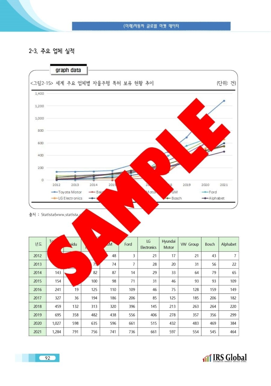 세계 자동차 / 자율주행차 / 커넥티드카 / 전기차(xEV) / 수소연료전지차(FCEV) / 통합이동서비스(MaaS) / 자동차 경량화 / 자동차 전장 / 각 분야별 글로벌 마켓 데이터