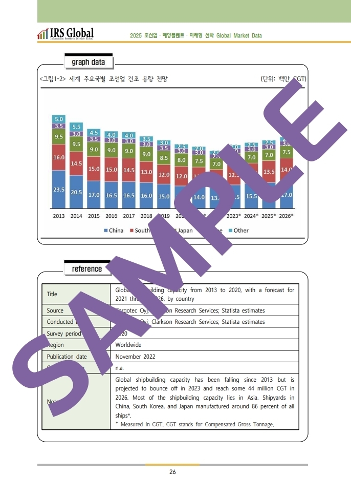 이에 IRS글로벌은 세계 1위를 차지했던 강력한 산업인 조선업과 해양플랜트 및 미래형 선박 관련 시장에 종사하는 분뿐만 아니라, 관심을 갖고 계신 모든 분들께 사업기획과 마케팅전략 수립에 도움을 드리고자 본서에 글로벌 시장에 대한 다양한 2차 자료를 체계적으로 정리하여 소개하였다.