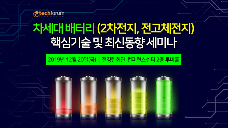 최신 기술 및 성장산업 관련 정보와 소통의 장을 제공하는 테크포럼은 2019년 12월 20일(금) 오전 10시에 전경련회관 컨퍼런스센터 2층 루비홀에서 '차세대 배터리(2차전지, 전고체전지) 핵심기술 및 최신동향 세미나'를 개최합니다.
