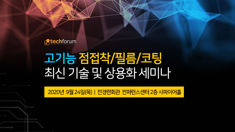 테크포럼(www.techforum.co.kr)은 9월 24일(목) 서울 여의도 전경련회관 컨퍼런스센터 2층 사파이어홀에서 '고기능 점접착/필름/코팅 최신 기술 및 상용화 세미나' 를 개최한다.